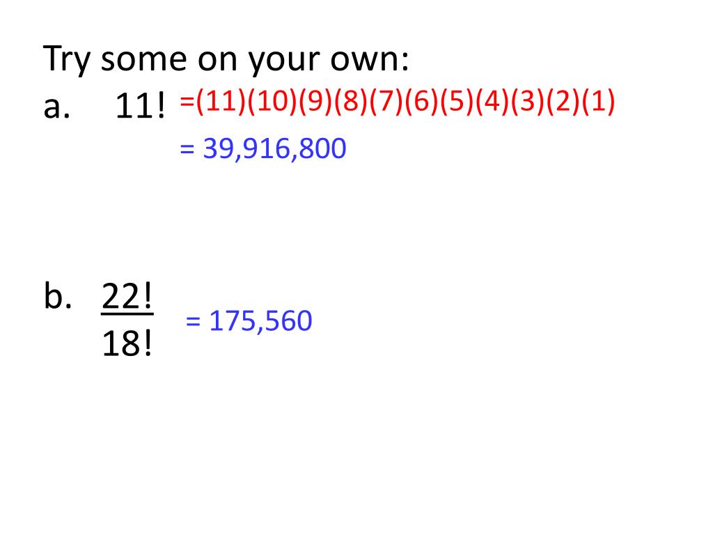 Try some on your own: a. 11! 22! 18! =(11)(10)(9)(8)(7)(6)(5)(4)(3)(2)(1) = 39,916,800 = 175,560