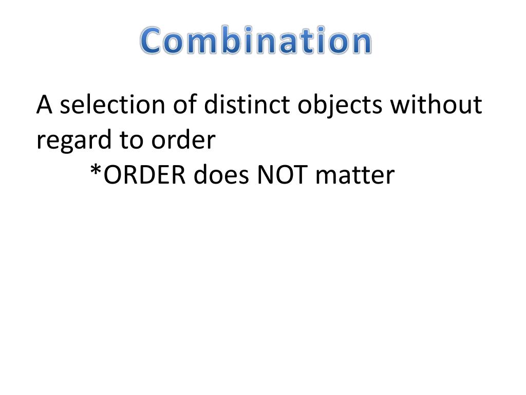 Combination A selection of distinct objects without regard to order *ORDER does NOT matter
