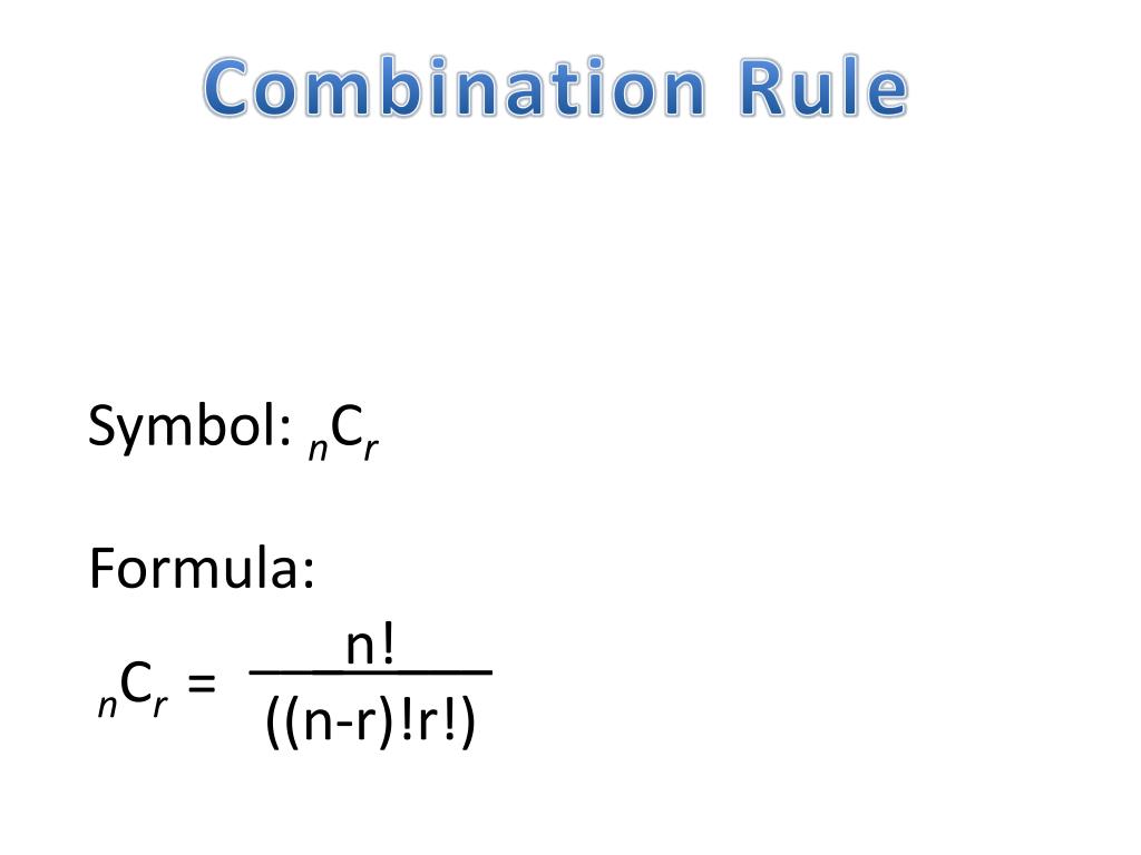Combination Rule Symbol: nCr Formula: ___n!___ ((n-r)!r!) nCr =