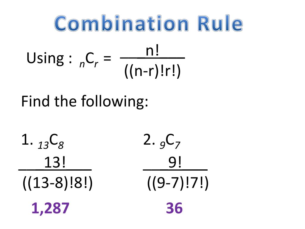 Combination Rule ___n!___ ((n-r)!r!) Using : nCr = Find the following: 1. 13C8 2. 9C7 ___13!___ ((13-8)!8!) ___9!___ ((9-7)!7!) 1,287 36