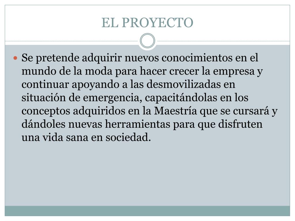 EL PROYECTO Se pretende adquirir nuevos conocimientos en el mundo de la moda para hacer crecer la empresa y continuar apoyando a las desmovilizadas en situación de emergencia, capacitándolas en los conceptos adquiridos en la Maestría que se cursará y dándoles nuevas herramientas para que disfruten una vida sana en sociedad.