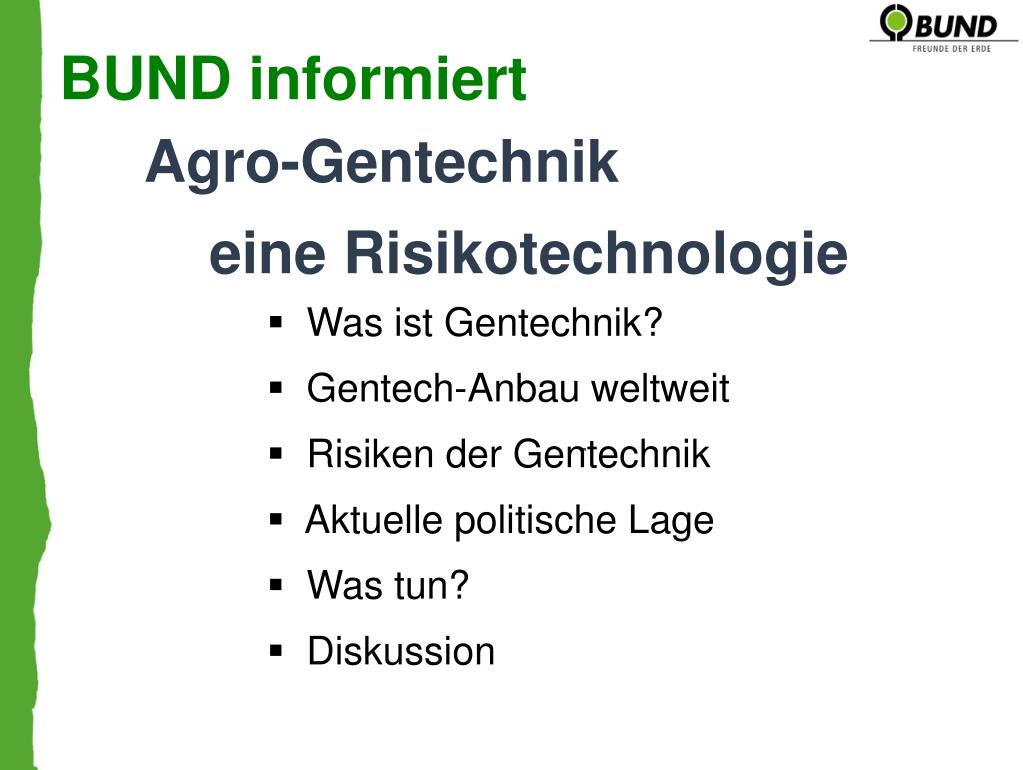 BUND informiert Agro-Gentechnik eine Risikotechnologie • Was ist Gentechnik? • Gentech-Anbau weltweit • Risiken der Gentechnik • Aktuelle politische Lage • Was tun? • Diskussion