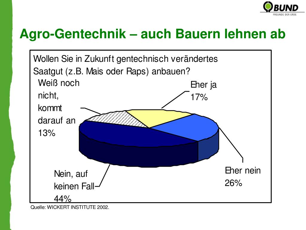 Agro-Gentechnik – Situation in Deutschland • Entwurf für neues Gentechnikgesetz • Wer haftet für mögliche Schäden? • Wie wird die „gute fachliche Praxis des Gentechnikanbaus“ geregelt? • Wie ist die Information der Öffentlichkeit? Sind die Standortregister öffentlich zugänglich? • Wie werden ökologisch sensible Gebiete und gentechnikfreie Regionen geschützt?