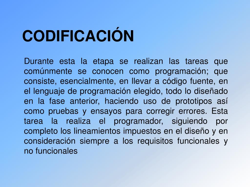 Durante esta la etapa se realizan las tareas que comúnmente se conocen como programación; que consiste, esencialmente, en llevar a código fuente, en el lenguaje de programación elegido, todo lo diseñado en la fase anterior, haciendo uso de prototipos así como pruebas y ensayos para corregir errores. Esta tarea la realiza el programador, siguiendo por completo los lineamientos impuestos en el diseño y en consideración siempre a los requisitos funcionales y no funcionales CODIFICACIÓN
