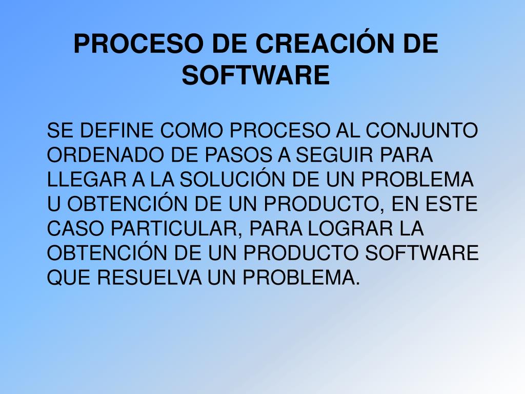 Proceso de creación de software Se define como Proceso al conjunto ordenado de pasos a seguir para llegar a la solución de un problema u obtención de un producto, en este caso particular, para lograr la obtención de un producto software que resuelva un problema.