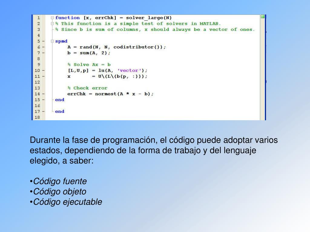 Durante la fase de programación, el código puede adoptar varios estados, dependiendo de la forma de trabajo y del lenguaje elegido, a saber: • Código fuente • Código objeto • Código ejecutable