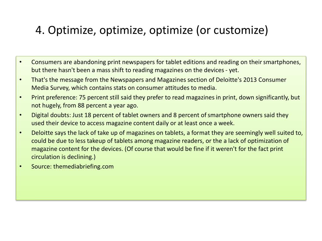 4. Optimize, optimize, optimize (or customize) • Consumers are abandoning print newspapers for tablet editions and reading on their smartphones, but there hasn't been a mass shift to reading magazines on the devices - yet. • That's the message from the Newspapers and Magazines section of Deloitte's 2013 Consumer Media Survey, which contains stats on consumer attitudes to media. • Print preference: 75 percent still said they prefer to read magazines in print, down significantly, but not hugely, from 88 percent a year ago. • Digital doubts: Just 18 percent of tablet owners and 8 percent of smartphone owners said they used their device to access magazine content daily or at least once a week. • Deloitte says the lack of take up of magazines on tablets, a format they are seemingly well suited to, could be due to less takeup of tablets among magazine readers, or the a lack of optimization of magazine content for the devices. (Of course that would be fine if it weren't for the fact print circulation is declining.) • Source: themediabriefing.com