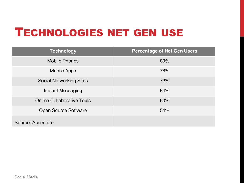 The net generation The Net Generation born between 1977 and 1997 are the largest generation ever and will represent almost half of the workforce by 2014. This generation believes it is “cool to be smart”. They see themselves as part of the future success of the workplace. The Net Gens and subsequently the businesses that employ them approach learning and work collaboratively. A social trend is emerging where people exploit technologies obtaining things they need from one another to be successful. In order to compete with these individuals in the marketplace you must be able to successfully exploit social media. Social Media