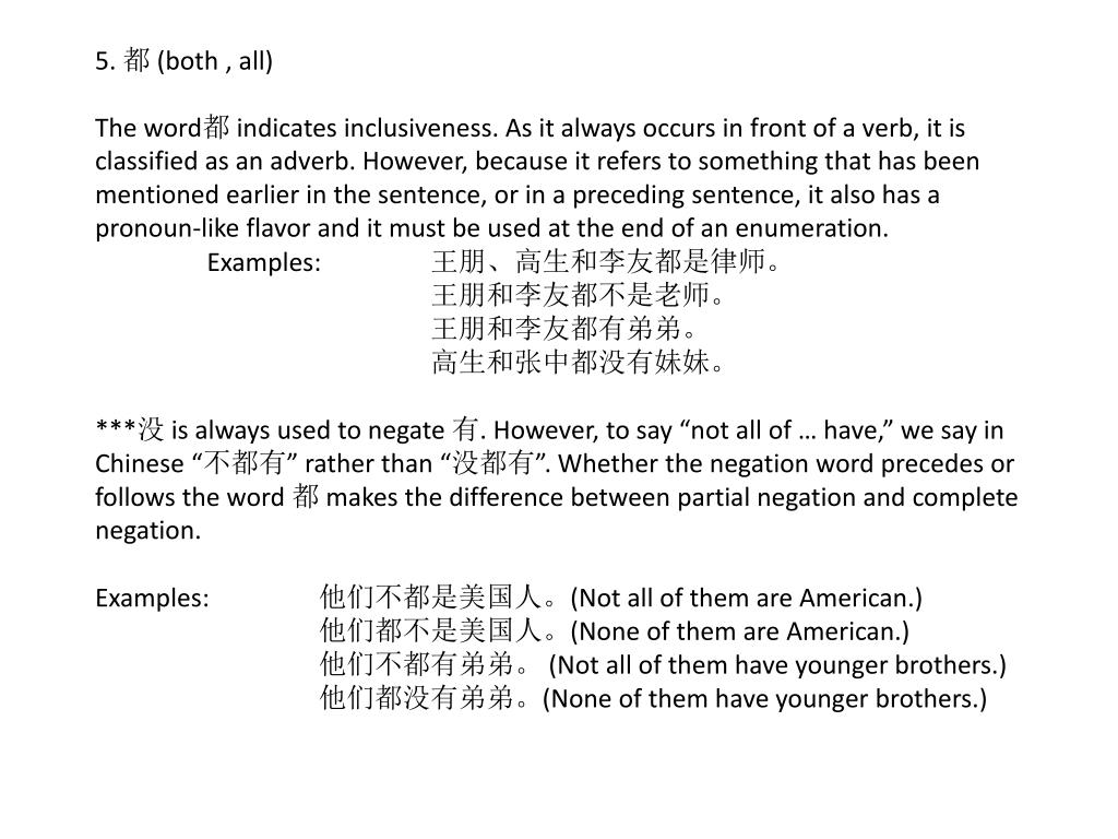 5. 都(both , all) • The word都 indicates inclusiveness. As it always occurs in front of a verb, it is classified as an adverb. However, because it refers to something that has been mentioned earlier in the sentence, or in a preceding sentence, it also has a pronoun-like flavor and it must be used at the end of an enumeration. • Examples: 王朋、高生和李友都是律师。 • 王朋和李友都不是老师。 • 王朋和李友都有弟弟。 • 高生和张中都没有妹妹。 • ***没 is always used to negate 有. However, to say “not all of … have,” we say in Chinese “不都有” rather than “没都有”. Whether the negation word precedes or follows the word 都 makes the difference between partial negation and complete negation. • Examples: 他们不都是美国人。(Not all of them are American.) • 他们都不是美国人。(None of them are American.) • 他们不都有弟弟。 (Not all of them have younger brothers.) • 他们都没有弟弟。(None of them have younger brothers.)