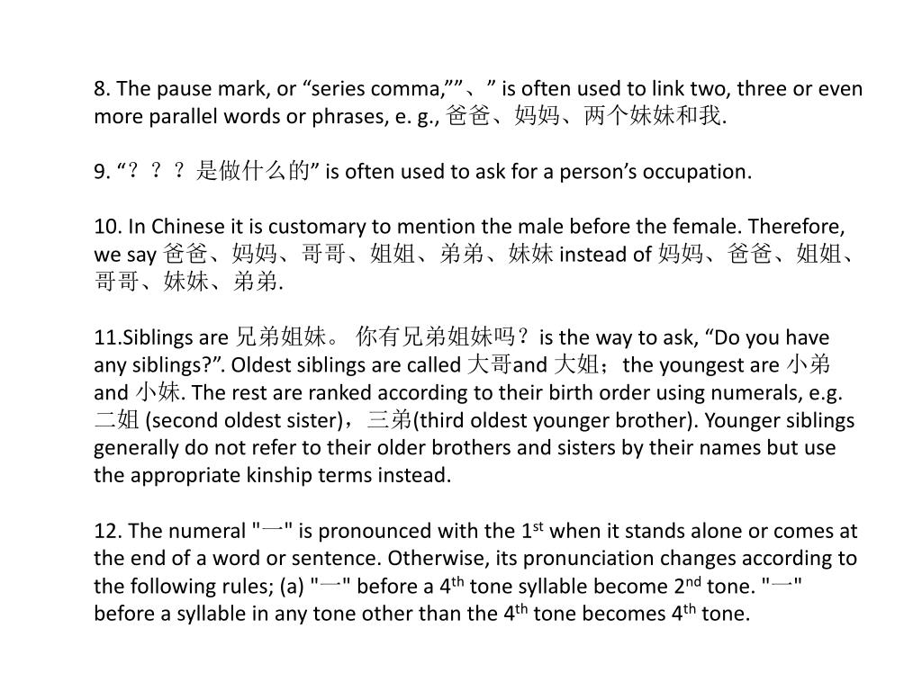 8. The pause mark, or “series comma,””、” is often used to link two, three or even more parallel words or phrases, e. g., 爸爸、妈妈、两个妹妹和我. • 9. “???是做什么的” is often used to ask for a person’s occupation. • 10. In Chinese it is customary to mention the male before the female. Therefore, we say 爸爸、妈妈、哥哥、姐姐、弟弟、妹妹 instead of 妈妈、爸爸、姐姐、哥哥、妹妹、弟弟. • 11.Siblings are 兄弟姐妹。 你有兄弟姐妹吗?istheway to ask, “Do you have any siblings?”. Oldest siblings are called 大哥and 大姐;the youngest are 小弟and 小妹.Therestarerankedaccordingtotheirbirthorderusingnumerals,e.g. 二姐 (second oldest sister),三弟(third oldest younger brother). Younger siblings generally do not refer to their older brothers and sisters by their names but use the appropriate kinship terms instead. • 12. The numeral "一" is pronounced with the 1st when it stands alone or comes at the end of a word or sentence. Otherwise, its pronunciation changes according to the following rules; (a) "一" before a 4th tone syllable become 2nd tone. "一" before a syllable in any tone other than the 4th tone becomes 4th tone.