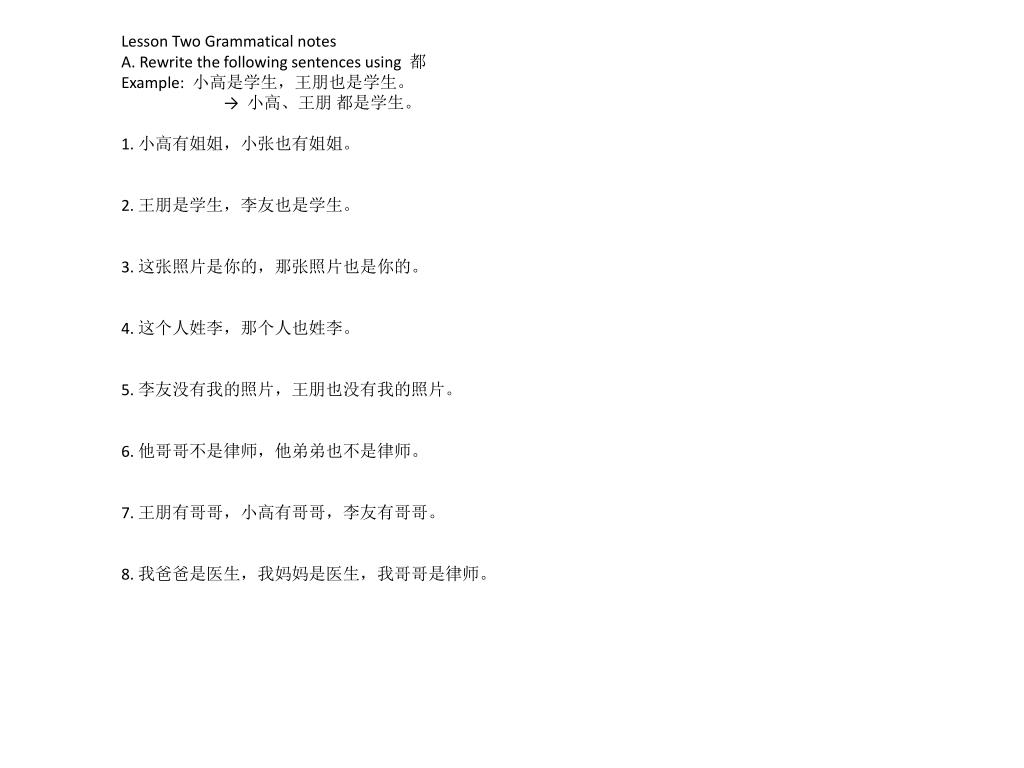 Lesson Two Grammatical notes A. Rewrite the following sentences using 都 Example: 小高是学生,王朋也是学生。 → 小高、王朋 都是学生。 1. 小高有姐姐,小张也有姐姐。 2. 王朋是学生,李友也是学生。 3. 这张照片是你的,那张照片也是你的。 4. 这个人姓李,那个人也姓李。 5. 李友没有我的照片,王朋也没有我的照片。 6. 他哥哥不是律师,他弟弟也不是律师。 7. 王朋有哥哥,小高有哥哥,李友有哥哥。 8. 我爸爸是医生,我妈妈是医生,我哥哥是律师。