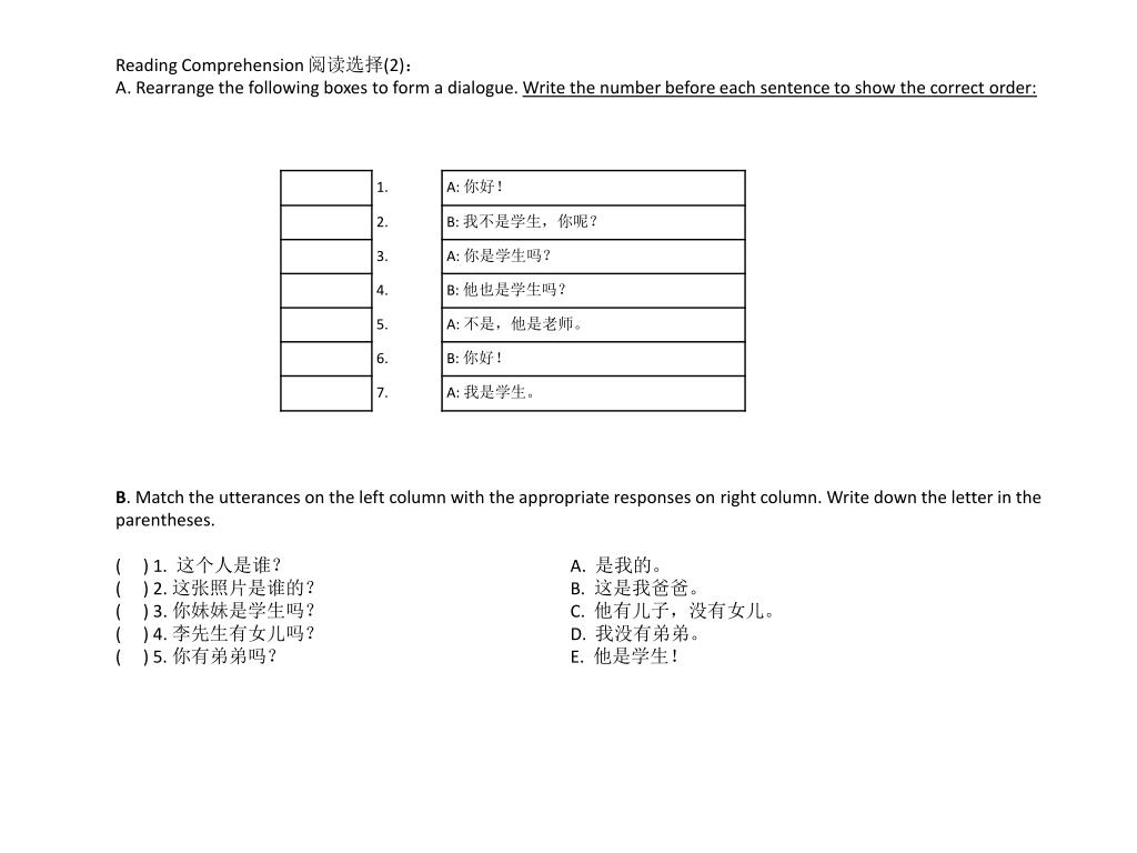 Reading Comprehension 阅读选择(2): A. Rearrange the following boxes to form a dialogue. Write the number before each sentence to show the correct order: B. Match the utterances on the left column with the appropriate responses onright column. Write down the letter in the parentheses. ( ) 1. 这个人是谁? A. 是我的。 ( ) 2. 这张照片是谁的? B. 这是我爸爸。 ( ) 3. 你妹妹是学生吗? C. 他有儿子,没有女儿。 ( ) 4. 李先生有女儿吗? D. 我没有弟弟。 ( ) 5. 你有弟弟吗? E. 他是学生!