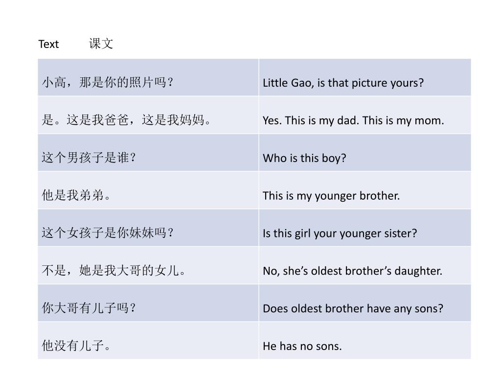 4. In Chinese, 家can refer to one’s family as well as one’s home. So, one can point to her family picture and say “我家有四个人”(There are four people in my family) and one can also point to her house and say “这是我的家”(This is my home.) • 5. For the number of people in a family, another measure word口 is also used. The original tone for measure word 个 is the 4th tone. However, in actual speech it is always pronounced as neutral tone word. • 6. The possessive particle 的is usually omitted after a personal pronoun and before a kinship term. Therefore, we say”王朋的妈妈” (Wang Peng’s mother) with 的 but “我妈妈” without 的. • 7. Although considered a conjunction and translated as “and”, 和 cannot link two clauses or two sentences as “and’ can in English. We say: “我爸爸是老师, 我妈妈是医生”. We don’tsay: "我爸爸是老师, 和我妈妈是医生".