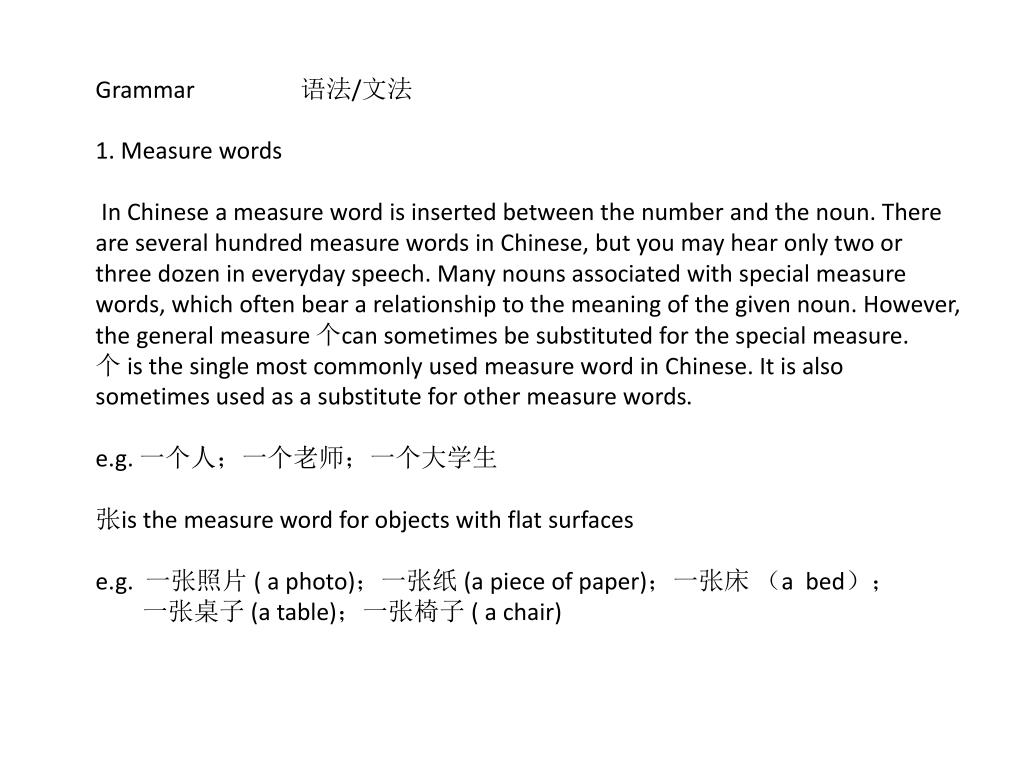 Grammar 语法/文法 • 1. Measure words • In Chinese a measure word is inserted between the number and the noun. There are several hundred measure words in Chinese, but you may hear only two or three dozen in everyday speech. Many nouns associated with special measure words, which often bear a relationship to the meaning of the given noun. However, the general measure 个can sometimes be substituted for the special measure. • 个 is the single most commonly used measure word in Chinese. It is also sometimes used as a substitute for other measure words. • e.g. 一个人;一个老师;一个大学生 • 张is the measure word for objects with flat surfaces • e.g. 一张照片 ( a photo);一张纸 (a piece of paper);一张床 (a bed); • 一张桌子 (a table);一张椅子 ( a chair)