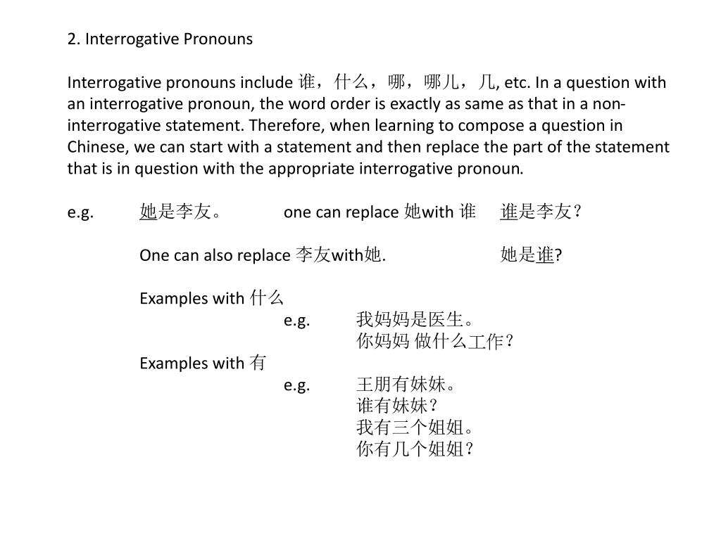 2. Interrogative Pronouns • Interrogative pronouns include 谁,什么,哪,哪儿,几, etc. In a question with an interrogative pronoun, the word order is exactly as same as that in a non-interrogative statement. Therefore, when learning to compose a question in Chinese, we can start with a statement and then replace the part of the statement that is in question with the appropriate interrogative pronoun. • e.g. 她是李友。 one can replace 她with 谁谁是李友? • One can also replace 李友with她. 她是谁? • Examples with 什么 • e.g. 我妈妈是医生。 • 你妈妈 做什么工作? • Examples with 有 • e.g. 王朋有妹妹。 • 谁有妹妹? • 我有三个姐姐。 • 你有几个姐姐?