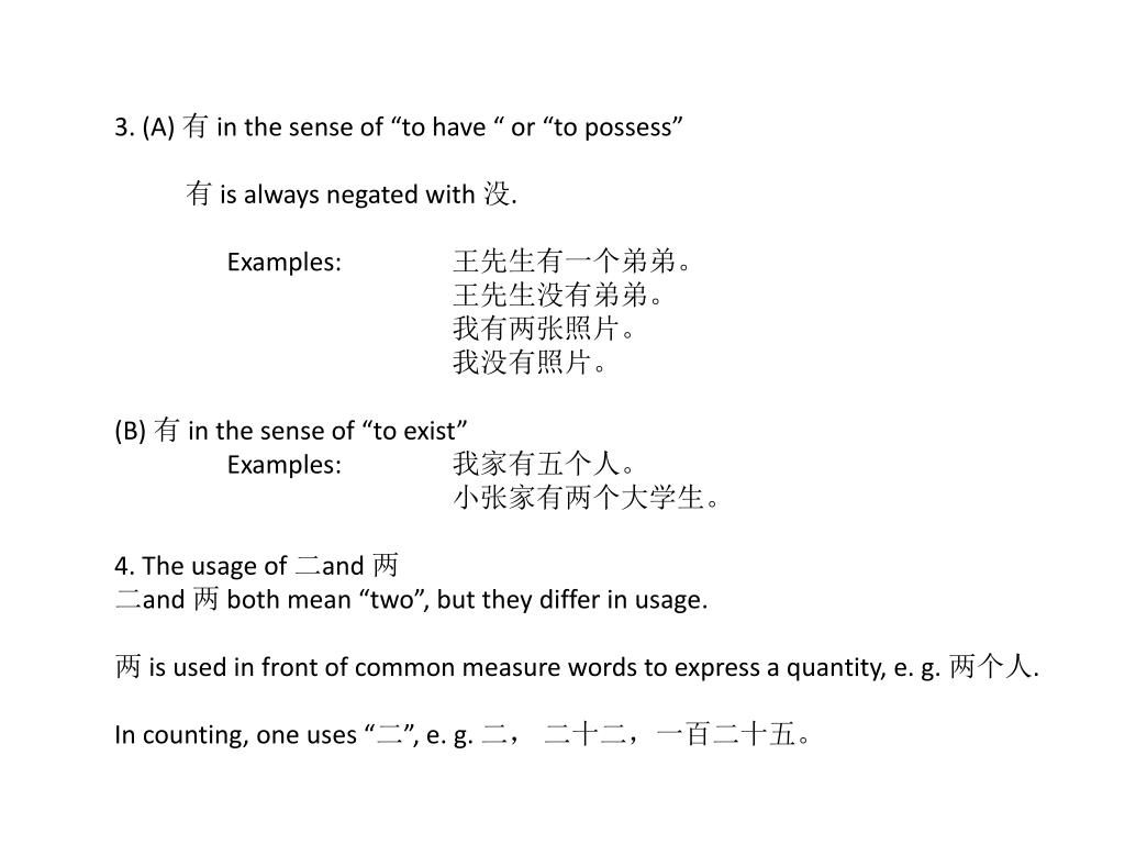 3. (A) 有 in the sense of “to have “ or “to possess” • 有is always negated with 没. • Examples: 王先生有一个弟弟。 • 王先生没有弟弟。 • 我有两张照片。 • 我没有照片。 • (B) 有 in the sense of “to exist” • Examples: 我家有五个人。 • 小张家有两个大学生。 • 4. The usage of 二and 两 • 二and 两 both mean “two”, but they differ in usage. • 两is used in front of common measure words to express a quantity, e. g. 两个人. • In counting, one uses “二”, e. g. 二, 二十二,一百二十五。