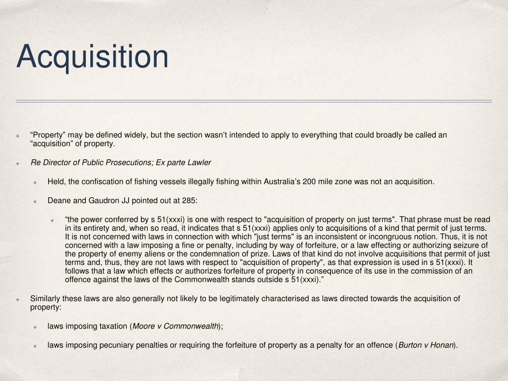 Acquisition • “Property” may be defined widely, but the section wasn’t intended to apply to everything that could broadly be called an “acquisition” of property. • Re Director of Public Prosecutions; Ex parte Lawler • Held, the confiscation of fishing vessels illegally fishing within Australia’s 200 mile zone was not an acquisition. • Deane and Gaudron JJ pointed out at 285: • “the power conferred by s 51(xxxi) is one with respect to "acquisition of property on just terms". That phrase must be read in its entirety and, when so read, it indicates that s 51(xxxi) applies only to acquisitions of a kind that permit of just terms. It is not concerned with laws in connection with which "just terms" is an inconsistent or incongruous notion. Thus, it is not concerned with a law imposing a fine or penalty, including by way of forfeiture, or a law effecting or authorizing seizure of the property of enemy aliens or the condemnation of prize. Laws of that kind do not involve acquisitions that permit of just terms and, thus, they are not laws with respect to "acquisition of property", as that expression is used in s 51(xxxi). It follows that a law which effects or authorizes forfeiture of property in consequence of its use in the commission of an offence against the laws of the Commonwealth stands outside s 51(xxxi).” • Similarly these laws are also generally not likely to be legitimately characterised as laws directed towards the acquisition of property: • laws imposing taxation (Moore v Commonwealth); • laws imposing pecuniary penalties or requiring the forfeiture of property as a penalty for an offence (Burton v Honan).