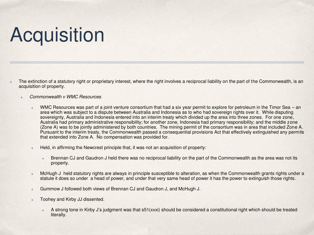 Acquisition • The extinction of a statutory right or proprietary interest, where the right involves a reciprocal liability on the part of the Commonwealth, is an acquisition of property. • Commonwealth v WMC Resources • WMC Resources was part of a joint venture consortium that had a six year permit to explore for petroleum in the Timor Sea – an area which was subject to a dispute between Australia and Indonesia as to who had sovereign rights over it. While disputing sovereignty, Australia and Indonesia entered into an interim treaty which divided up the area into three zones. For one zone, Australia had primary administrative responsibility; for another zone, Indonesia had primary responsibility; and the middle zone (Zone A) was to be jointly administered by both countries. The mining permit of the consortium was in area that included Zone A. Pursuant to the interim treaty, the Commonwealth passed a consequential provisions Act that effectively extinguished any permits that extended into Zone A. No compensation was provided for. • Held, in affirming the Newcrest principle that, it was not an acquisition of property: • Brennan CJ and Gaudron J held there was no reciprocal liability on the part of the Commonwealth as the area was not its property. • McHugh J held statutory rights are always in principle susceptible to alteration, as when the Commonwealth grants rights under a statute it does so under a head of power, and under that very same head of power it has the power to extinguish those rights. • Gummow J followed both views of Brennan CJ and Gaudron J, and McHugh J. • Toohey and Kirby JJ dissented. • A strong tone in Kirby J’s judgment was that s51(xxxi) should be considered a constitutional right which should be treated literally.