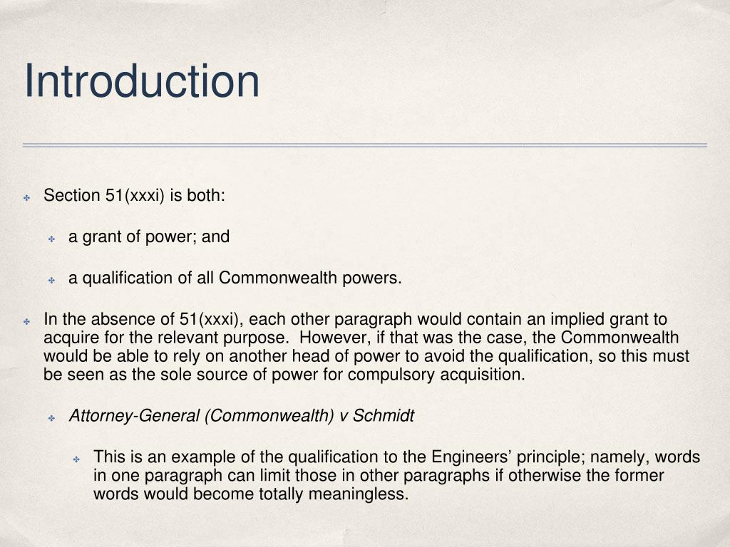 Introduction • Section 51(xxxi) is both: • a grant of power; and • a qualification of all Commonwealth powers. • In the absence of 51(xxxi), each other paragraph would contain an implied grant to acquire for the relevant purpose. However, if that was the case, the Commonwealth would be able to rely on another head of power to avoid the qualification, so this must be seen as the sole source of power for compulsory acquisition. • Attorney-General (Commonwealth) v Schmidt • This is an example of the qualification to the Engineers’ principle; namely, words in one paragraph can limit those in other paragraphs if otherwise the former words would become totally meaningless.