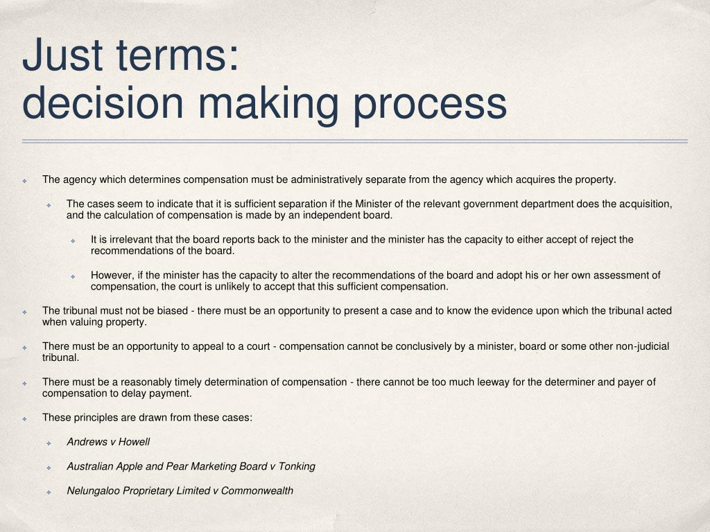 Just terms: decision making process • The agency which determines compensation must be administratively separate from the agency which acquires the property. • The cases seem to indicate that it is sufficient separation if the Minister of the relevant government department does the acquisition, and the calculation of compensation is made by an independent board. • It is irrelevant that the board reports back to the minister and the minister has the capacity to either accept of reject the recommendations of the board. • However, if the minister has the capacity to alter the recommendations of the board and adopt his or her own assessment of compensation, the court is unlikely to accept that this sufficient compensation. • The tribunal must not be biased - there must be an opportunity to present a case and to know the evidence upon which the tribunal acted when valuing property. • There must be an opportunity to appeal to a court - compensation cannot be conclusively by a minister, board or some other non-judicial tribunal. • There must be a reasonably timely determination of compensation - there cannot be too much leeway for the determiner and payer of compensation to delay payment. • These principles are drawn from these cases: • Andrews v Howell • Australian Apple and Pear Marketing Board v Tonking • Nelungaloo Proprietary Limited v Commonwealth
