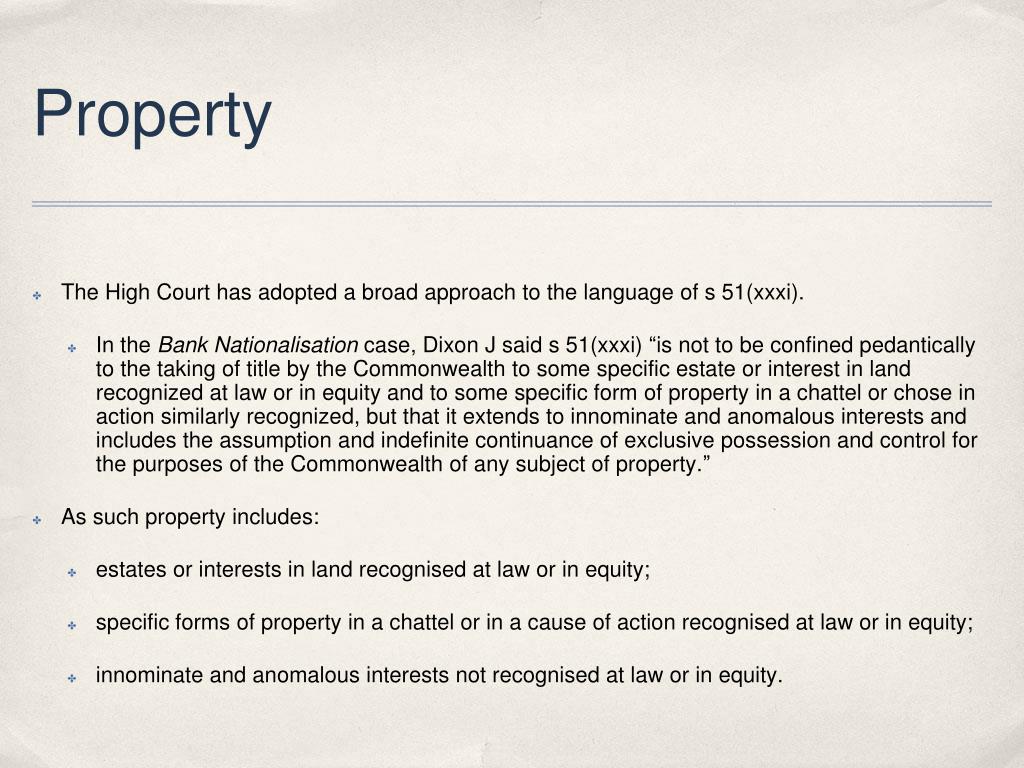 Property • The High Court has adopted a broad approach to the language of s 51(xxxi). • In the Bank Nationalisationcase, Dixon J said s 51(xxxi) “is not to be confined pedantically to the taking of title by the Commonwealth to some specific estate or interest in land recognized at law or in equity and to some specific form of property in a chattel or chose in action similarly recognized, but that it extends to innominate and anomalous interests and includes the assumption and indefinite continuance of exclusive possession and control for the purposes of the Commonwealth of any subject of property.” • As such property includes: • estates or interests in land recognised at law or in equity; • specific forms of property in a chattel or in a cause of action recognised at law or in equity; • innominate and anomalous interests not recognised at law or in equity.