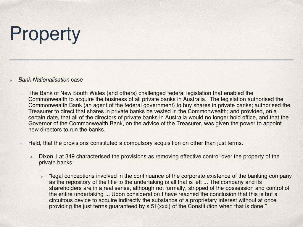 Property • Bank Nationalisationcase • The Bank of New South Wales (and others) challenged federal legislation that enabled the Commonwealth to acquire the business of all private banks in Australia. The legislation authorised the Commonwealth Bank (an agent of the federal government) to buy shares in private banks; authorised the Treasurer to direct that shares in private banks be vested in the Commonwealth; and provided, on a certain date, that all of the directors of private banks in Australia would no longer hold office, and that the Governor of the Commonwealth Bank, on the advice of the Treasurer, was given the power to appoint new directors to run the banks. • Held, that the provisions constituted a compulsory acquisition on other than just terms. • Dixon J at 349 characterised the provisions as removing effective control over the property of the private banks: • “legal conceptions involved in the continuance of the corporate existence of the banking company as the repository of the title to the undertaking is all that is left ... The company and its shareholders are in a real sense, although not formally, stripped of the possession and control of the entire undertaking ... Upon consideration I have reached the conclusion that this is but a circuitous device to acquire indirectly the substance of a proprietary interest without at once providing the just terms guaranteed by s 51(xxxi) of the Constitution when that is done.”