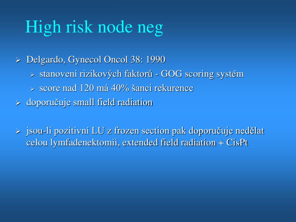 High risk node neg • Delgardo, Gynecol Oncol 38: 1990 • stanovení rizikových faktorů - GOG scoring systém • score nad 120 má 40% šanci rekurence • doporučuje small field radiation • jsou-li pozitivní LU z frozen section pak doporučuje nedělat celou lymfadenektomii, extended field radiation + CisPt