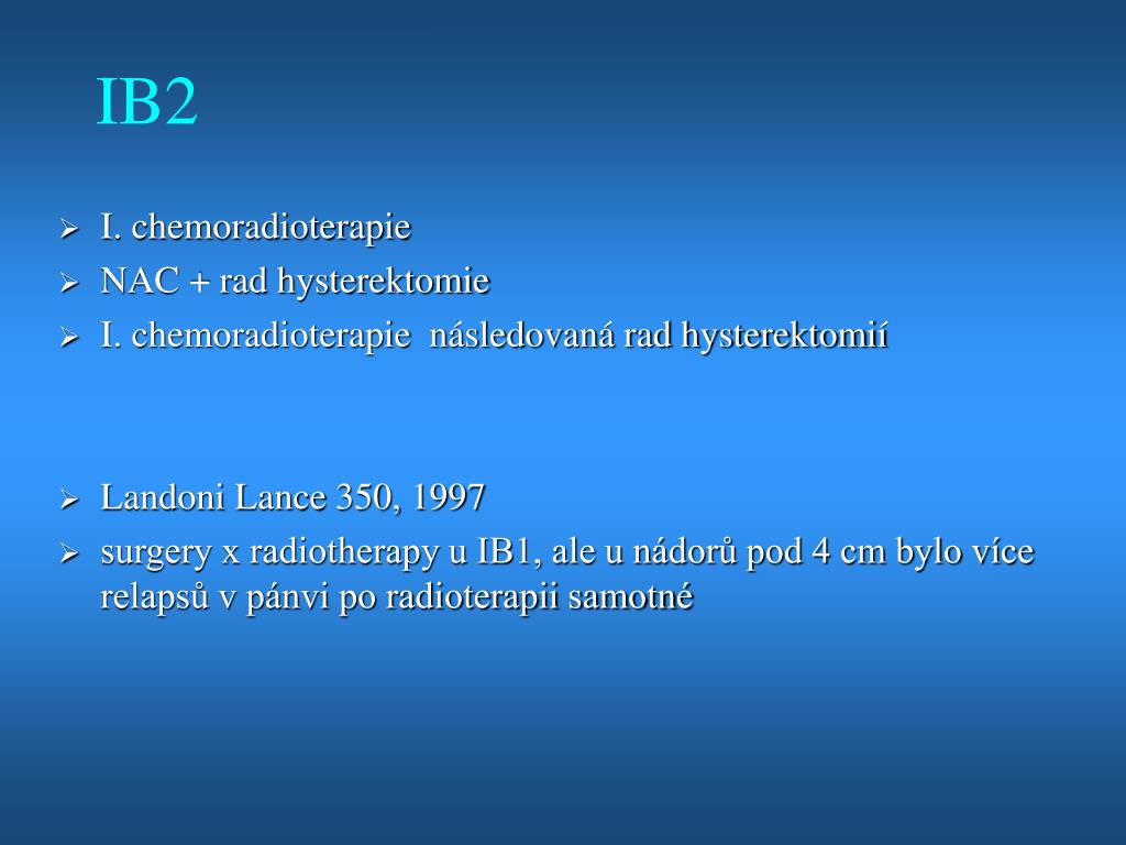 IB2 • I. chemoradioterapie • NAC + rad hysterektomie • I. chemoradioterapie následovaná rad hysterektomií • Landoni Lance 350, 1997 • surgery x radiotherapy u IB1, ale u nádorů pod 4 cm bylo více relapsů v pánvi po radioterapii samotné