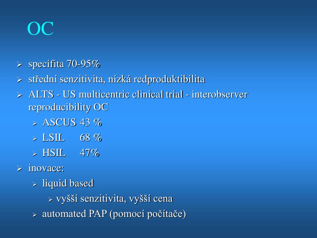 OC • specifita 70-95% • střední senzitivita, nízká redproduktibilita • ALTS - US multicentric clinical trial - interobserver reproducibility OC • ASCUS 43 % • LSIL 68 % • HSIL 47% • inovace: • liquid based • vyšší senzitivita, vyšší cena • automated PAP (pomocí počítače)