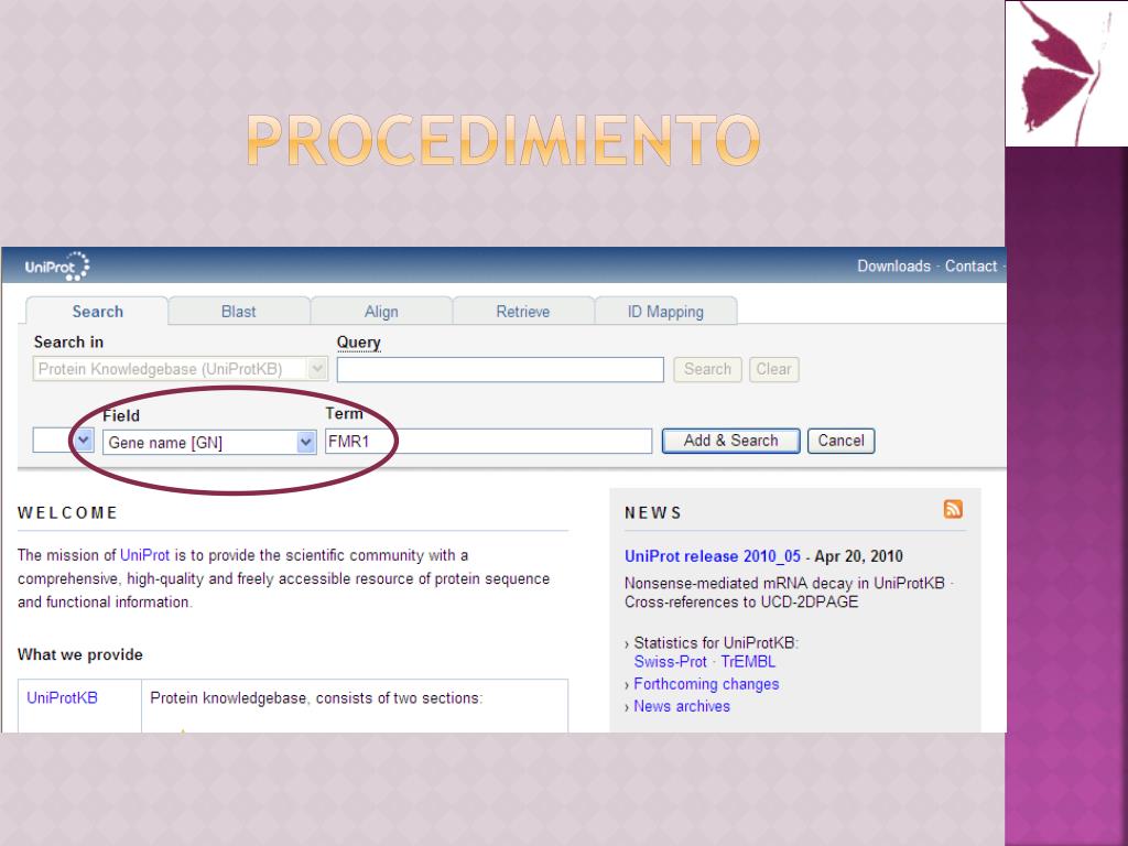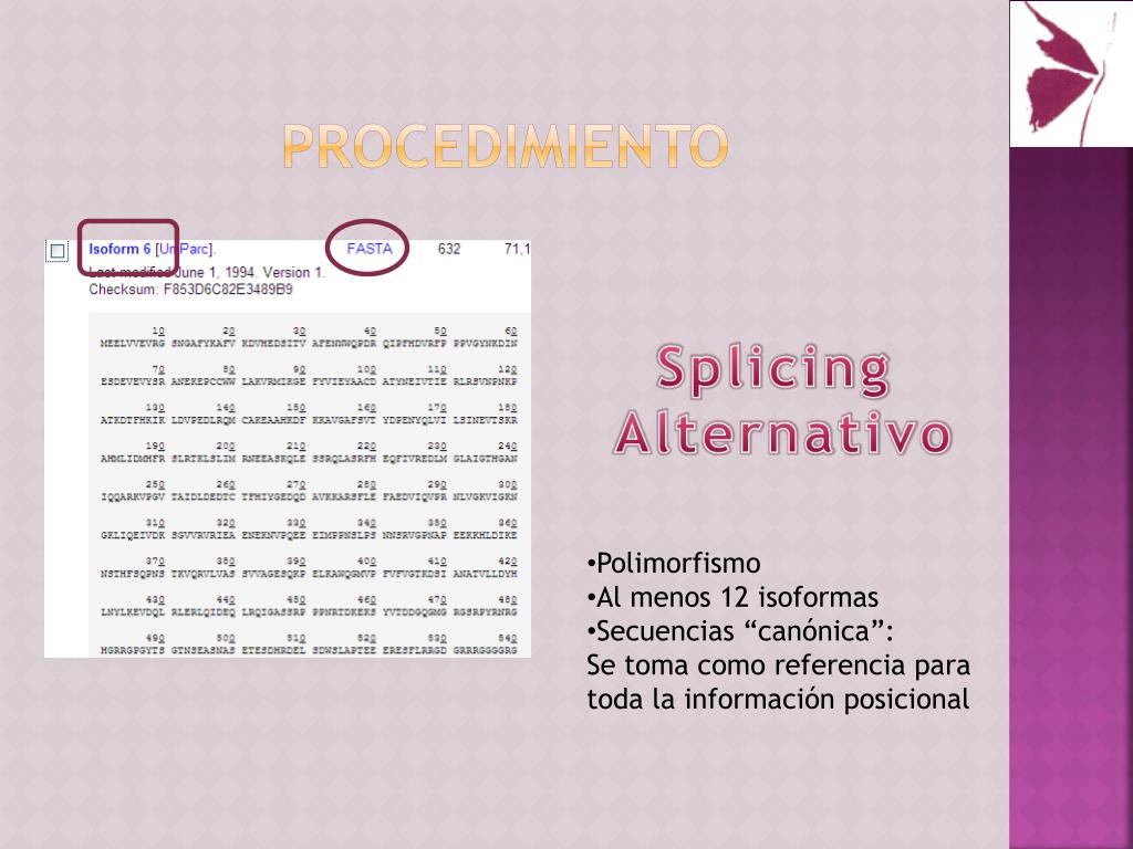 procedimiento Splicing Alternativo • Polimorfismo • Al menos 12 isoformas • Secuencias “canónica”: • Se toma como referencia para toda la información posicional