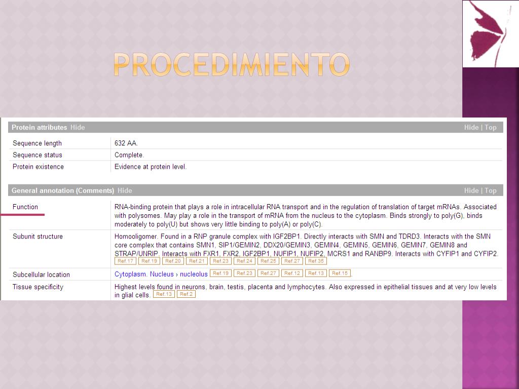 Información de la proteína ¿Proceso biológico? • Proteína de transporte del mRNA diana • Se encuentra tanto en el núcleo como en el citoplasma • Metilaciones y fosforilaciones