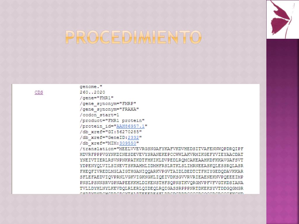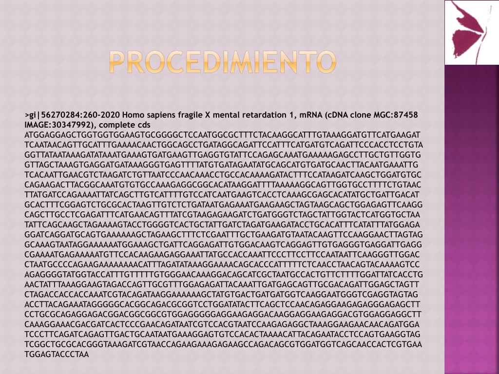 Práctica 1: Bases de datos moleculares. Búsqueda del gen de interés. En fermedad monogénica. Síndrome del x fragil. Ligado al cromosoma X Afecta a hombres y mujeres, aunque a éstas en menor grado, ya que el 2º cromosoma X les protege Primera causa de deficiencia mental hereditaria