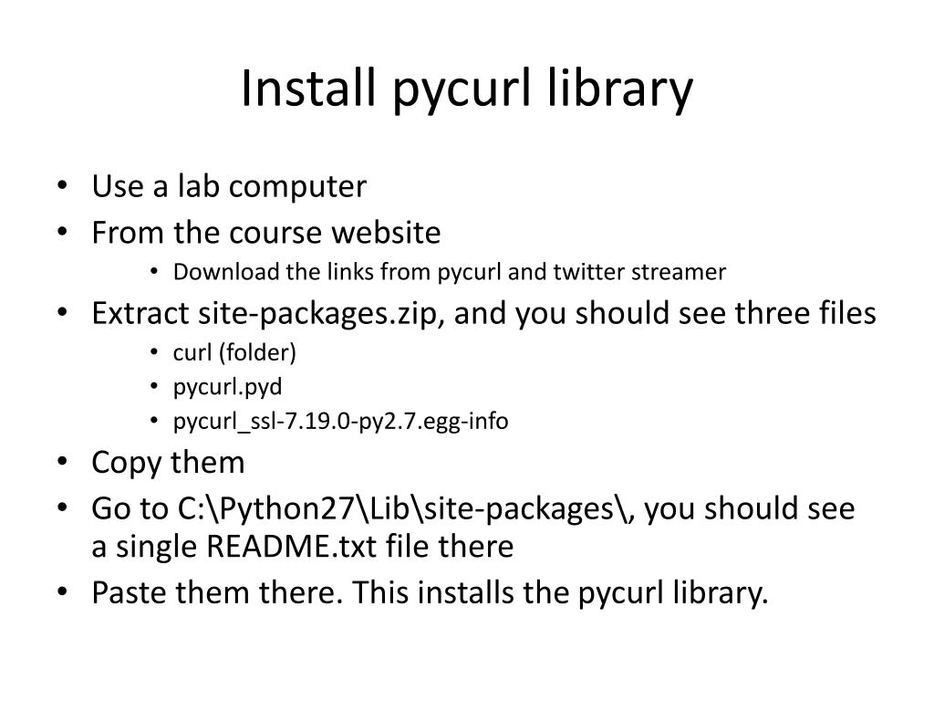 Streaming Twitter. Install pycurl library. Use a lab computer From the course website Download the links from pycurl and twitter streamer Extract site-packages.zip, and you should see three files curl (folder) pycurl.pyd pycurl_ssl-7.19.0-py2.7.egg-info Copy them