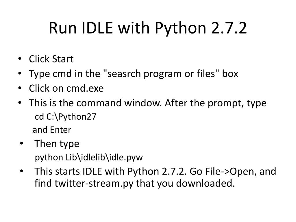 Run IDLE with Python 2.7.2 • Click Start • Type cmd in the "seasrch program or files" box • Click on cmd.exe • This is the command window. After the prompt, type cd C:\Python27 and Enter • Then type python Lib\idlelib\idle.pyw • This starts IDLE with Python 2.7.2. Go File->Open, and find twitter-stream.py that you downloaded.