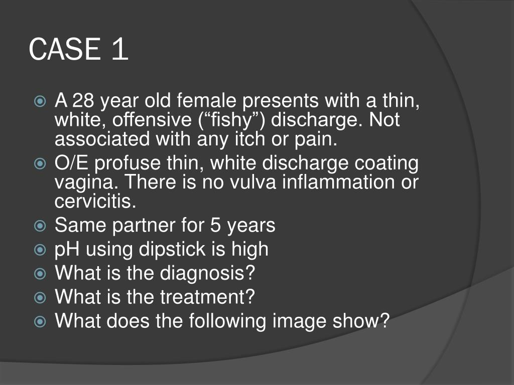 CASE 1 • A 28 year old female presents with a thin, white, offensive (“fishy”) discharge. Not associated with any itch or pain. • O/E profuse thin, white discharge coating vagina. There is no vulva inflammation or cervicitis. • Same partner for 5 years • pH using dipstick is high • What is the diagnosis? • What is the treatment? • What does the following image show?