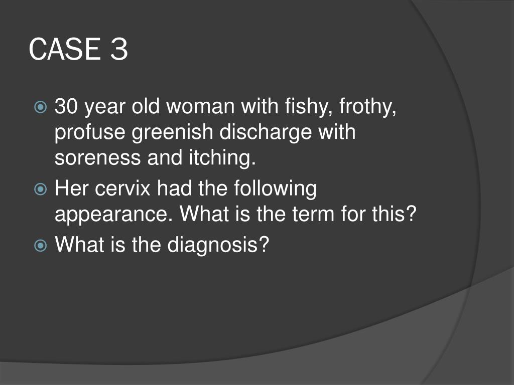 CASE 3 • 30 year old woman with fishy, frothy, profuse greenish discharge with soreness and itching. • Her cervix had the following appearance. What is the term for this? • What is the diagnosis?