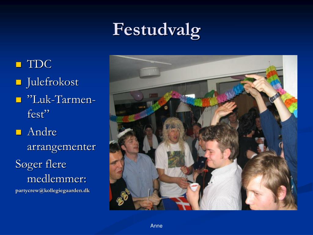 Festudvalg • TDC • Julefrokost • ”Luk-Tarmen-fest” • Andre arrangementer Søger flere medlemmer: partycrew@kollegiegaarden.dk Anne