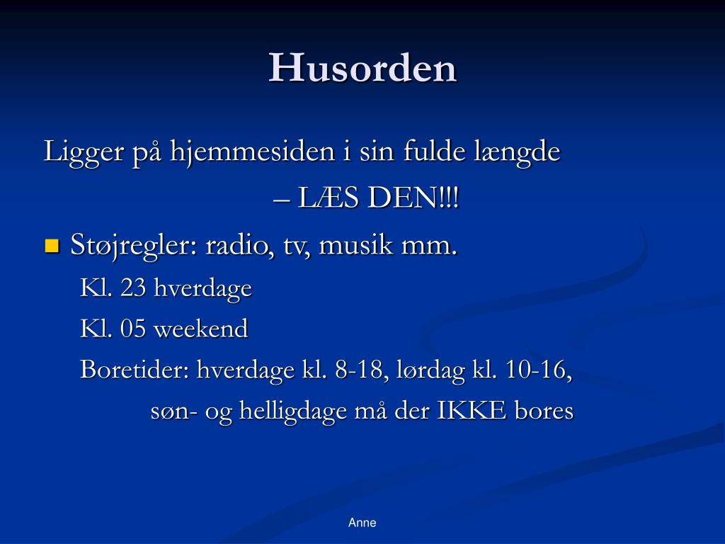 Anne Husorden Ligger på hjemmesiden i sin fulde længde – LÆS DEN!!! Støjregler: radio, tv, musik mm. Kl. 23 hverdage Kl. 05 weekend Boretider: hverdage kl. 8-18, lørdag kl. 10-16, søn- og helligdage må der IKKE bores