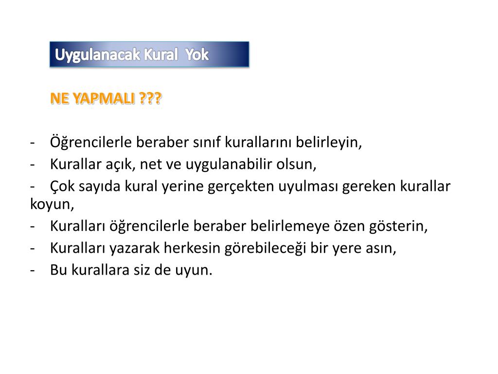 Uygulanacak Kural Yok NE YAPMALI ??? • Öğrencilerle beraber sınıf kurallarını belirleyin, • Kurallar açık, net ve uygulanabilir olsun, • Çok sayıda kural yerine gerçekten uyulması gereken kurallar koyun, • Kuralları öğrencilerle beraber belirlemeye özen gösterin, • Kuralları yazarak herkesin görebileceği bir yere asın, • Bu kurallara siz de uyun.