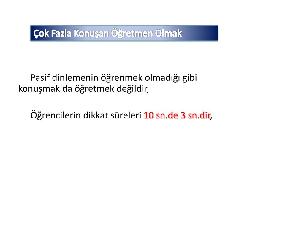 Çok Fazla Konuşan Öğretmen Olmak Pasif dinlemenin öğrenmek olmadığı gibi konuşmak da öğretmek değildir, Öğrencilerin dikkat süreleri 10 sn.de 3 sn.dir,