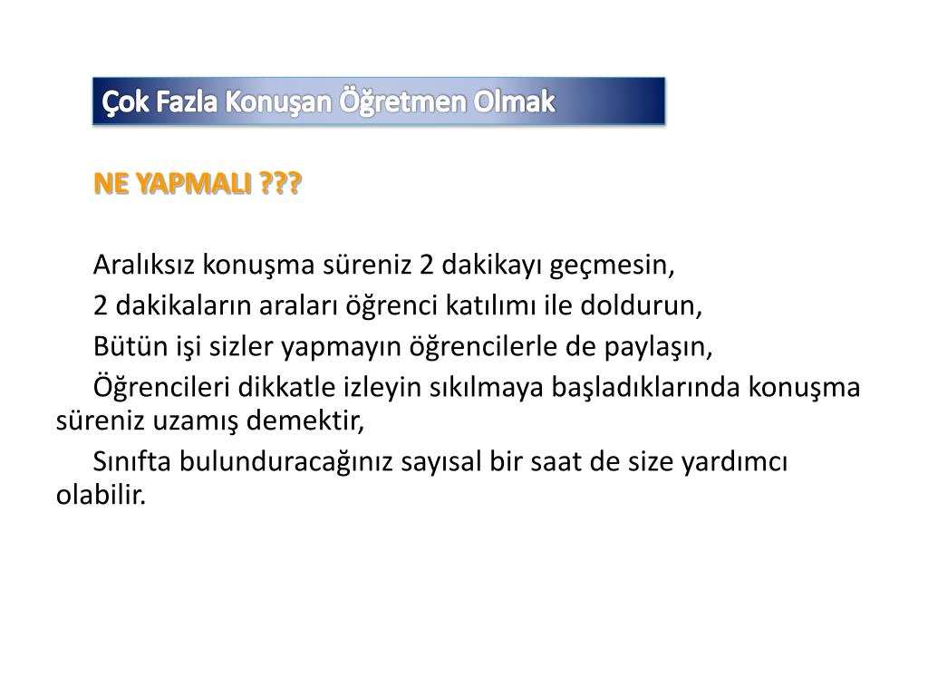Çok Fazla Konuşan Öğretmen Olmak NE YAPMALI ??? Aralıksız konuşma süreniz 2 dakikayı geçmesin, 2 dakikaların araları öğrenci katılımı ile doldurun, Bütün işi sizler yapmayın öğrencilerle de paylaşın, Öğrencileri dikkatle izleyin sıkılmaya başladıklarında konuşma süreniz uzamış demektir, Sınıfta bulunduracağınız sayısal bir saat de size yardımcı olabilir.