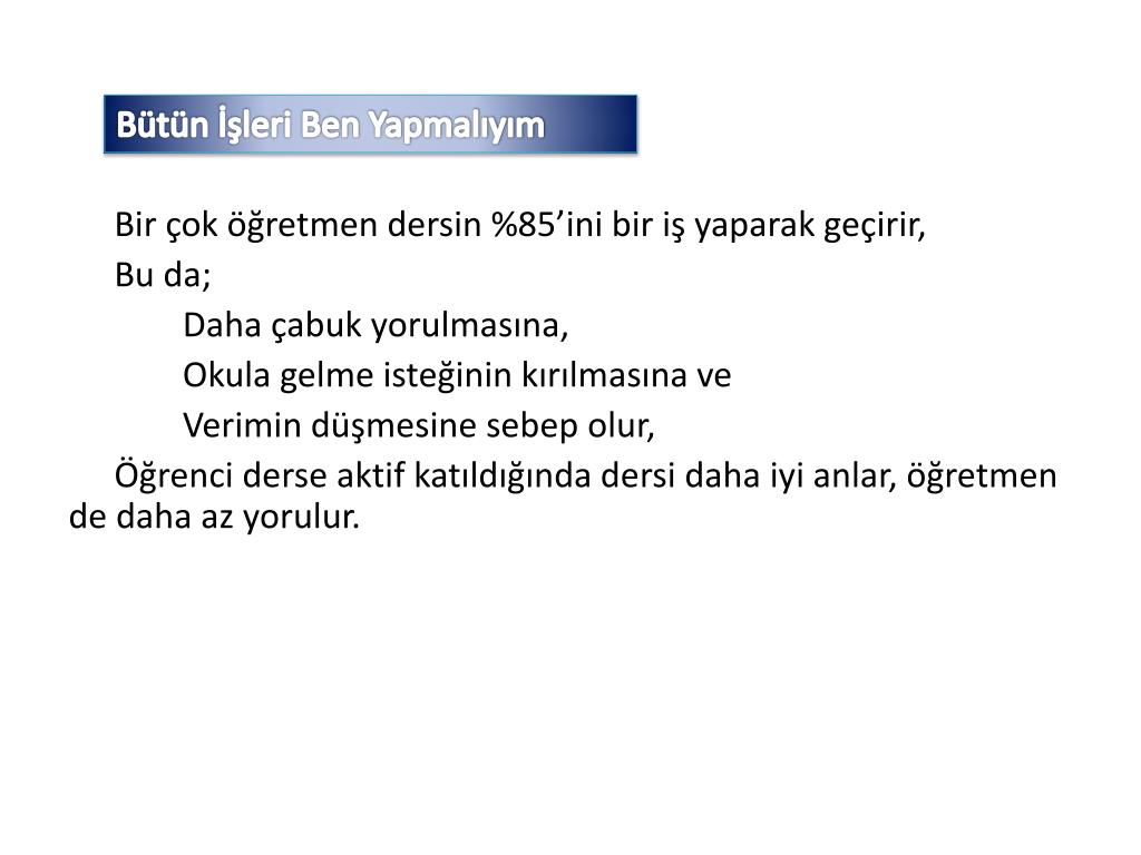 Bütün İşleri Ben Yapmalıyım Bir çok öğretmen dersin %85’ini bir iş yaparak geçirir, Bu da; Daha çabuk yorulmasına, Okula gelme isteğinin kırılmasına ve Verimin düşmesine sebep olur, Öğrenci derse aktif katıldığında dersi daha iyi anlar, öğretmen de daha az yorulur.