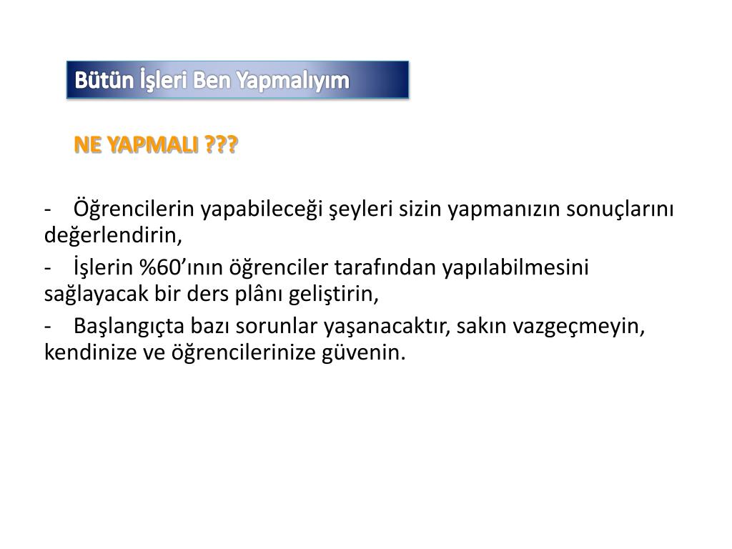 Bütün İşleri Ben Yapmalıyım NE YAPMALI ??? • Öğrencilerin yapabileceği şeyleri sizin yapmanızın sonuçlarını değerlendirin, • İşlerin %60’ının öğrenciler tarafından yapılabilmesini sağlayacak bir ders plânı geliştirin, • Başlangıçta bazı sorunlar yaşanacaktır, sakın vazgeçmeyin, kendinize ve öğrencilerinize güvenin.