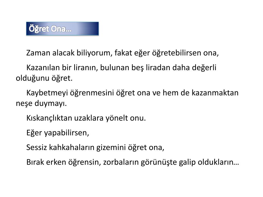 Öğret Ona… Zaman alacak biliyorum, fakat eğer öğretebilirsen ona, Kazanılan bir liranın, bulunan beş liradan daha değerli olduğunu öğret. Kaybetmeyi öğrenmesini öğret ona ve hem de kazanmaktan neşe duymayı. Kıskançlıktan uzaklara yönelt onu. Eğer yapabilirsen, Sessiz kahkahaların gizemini öğret ona, Bırak erken öğrensin, zorbaların görünüşte galip oldukların…