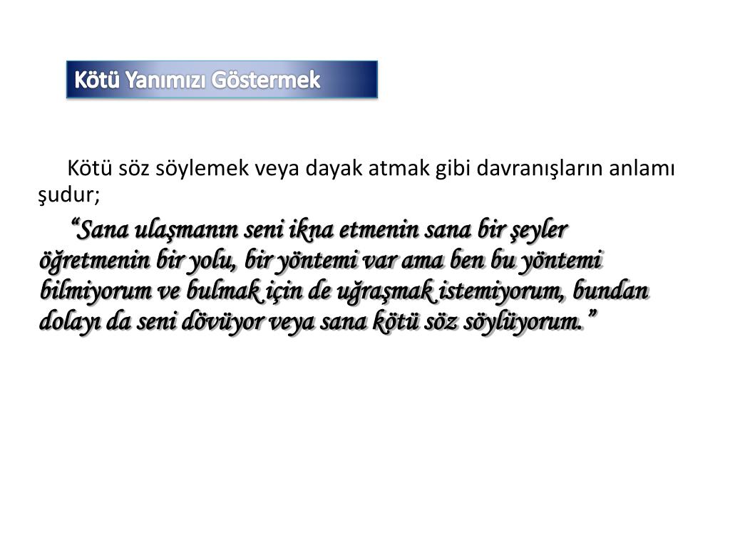 Kötü Yanımızı Göstermek Kötü söz söylemek veya dayak atmak gibi davranışların anlamı şudur; “Sana ulaşmanın seni ikna etmenin sana bir şeyler öğretmenin bir yolu, bir yöntemi var ama ben bu yöntemi bilmiyorum ve bulmak için de uğraşmak istemiyorum, bundan dolayı da seni dövüyor veya sana kötü söz söylüyorum.”