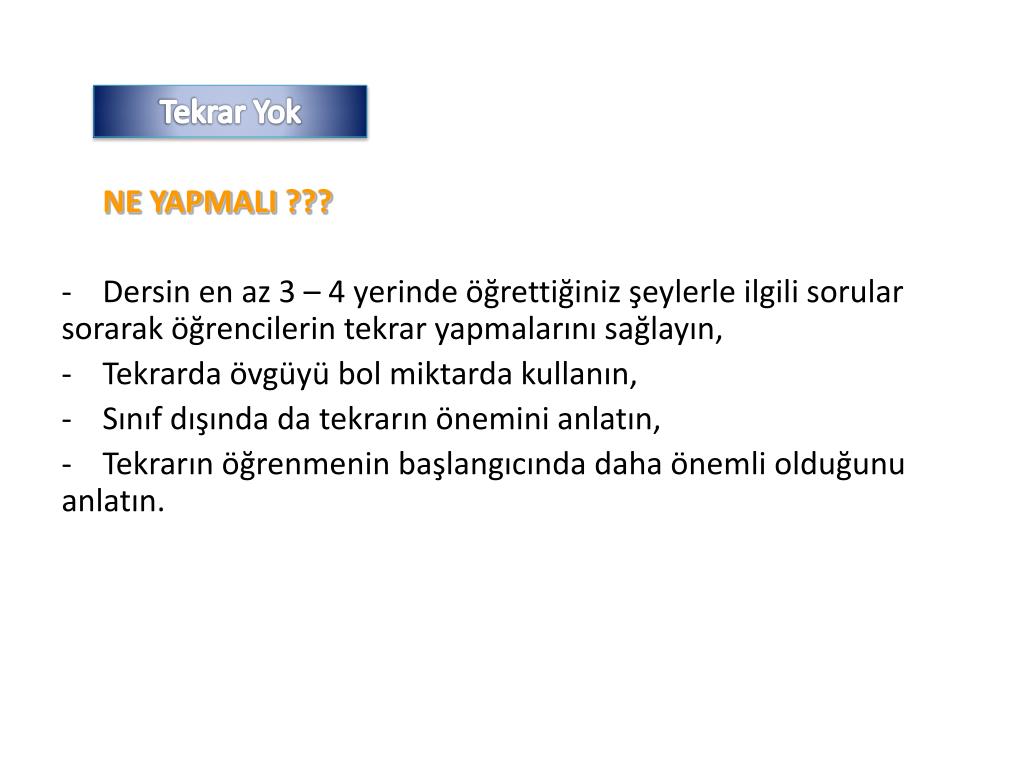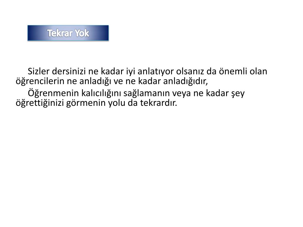 Tekrar Yok Sizler dersinizi ne kadar iyi anlatıyor olsanız da önemli olan öğrencilerin ne anladığı ve ne kadar anladığıdır, Öğrenmenin kalıcılığını sağlamanın veya ne kadar şey öğrettiğinizi görmenin yolu da tekrardır.