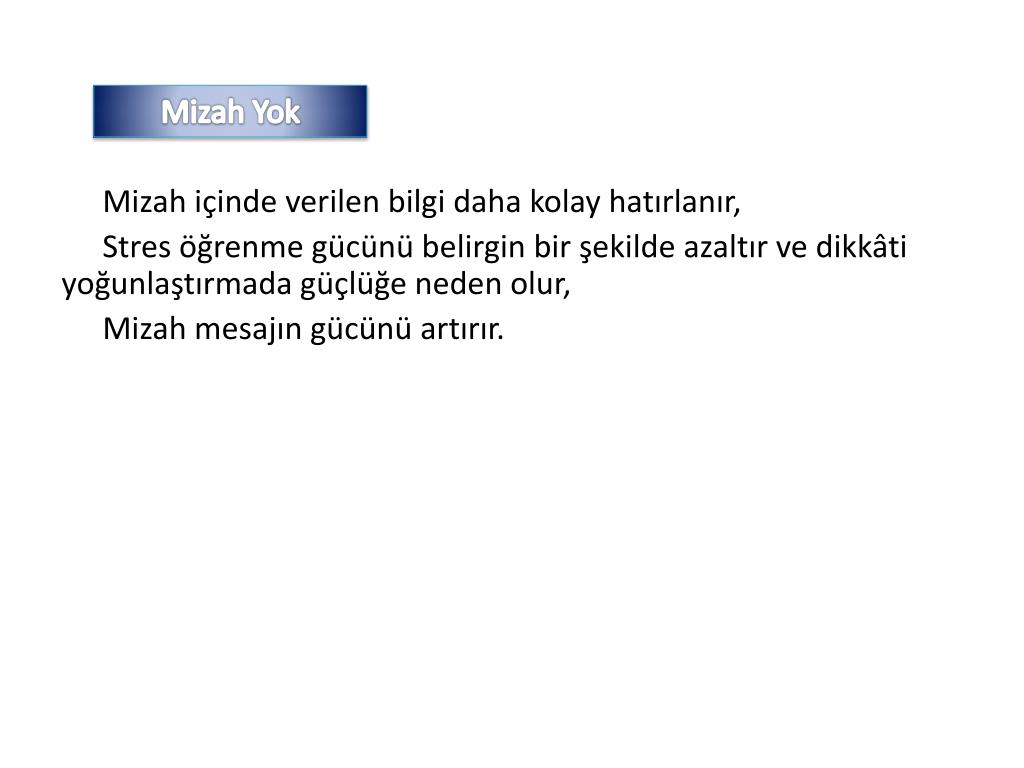 Mizah Yok Mizah içinde verilen bilgi daha kolay hatırlanır, Stres öğrenme gücünü belirgin bir şekilde azaltır ve dikkâti yoğunlaştırmada güçlüğe neden olur, Mizah mesajın gücünü artırır.