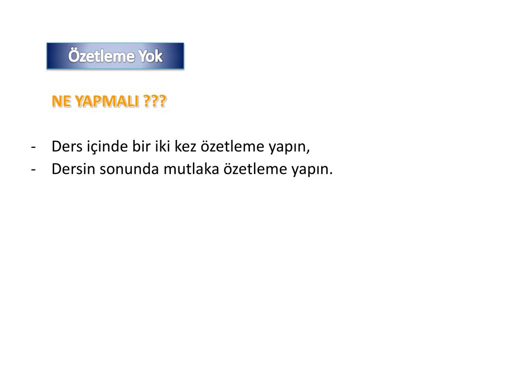Özetleme Yok NE YAPMALI ??? • Ders içinde bir iki kez özetleme yapın, • Dersin sonunda mutlaka özetleme yapın.