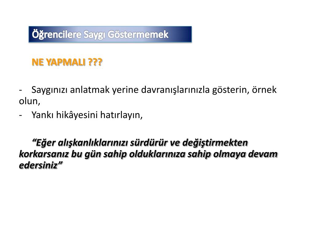 Öğrencilere Saygı Göstermemek NE YAPMALI ??? • Saygınızı anlatmak yerine davranışlarınızla gösterin, örnek olun, • Yankı hikâyesini hatırlayın, “Eğer alışkanlıklarınızı sürdürür ve değiştirmekten korkarsanız bu gün sahip olduklarınıza sahip olmaya devam edersiniz”