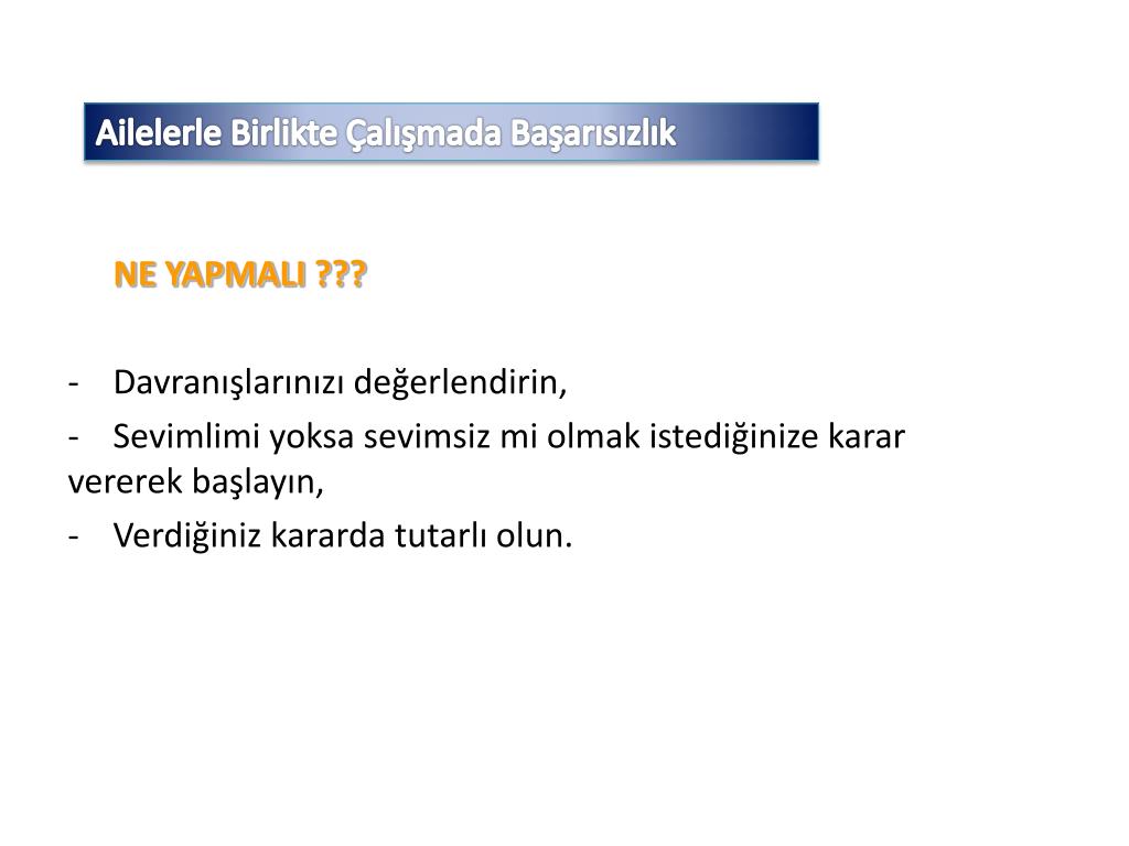 Ailelerle Birlikte Çalışmada Başarısızlık NE YAPMALI ??? • Davranışlarınızı değerlendirin, • Sevimlimi yoksa sevimsiz mi olmak istediğinize karar vererek başlayın, • Verdiğiniz kararda tutarlı olun.